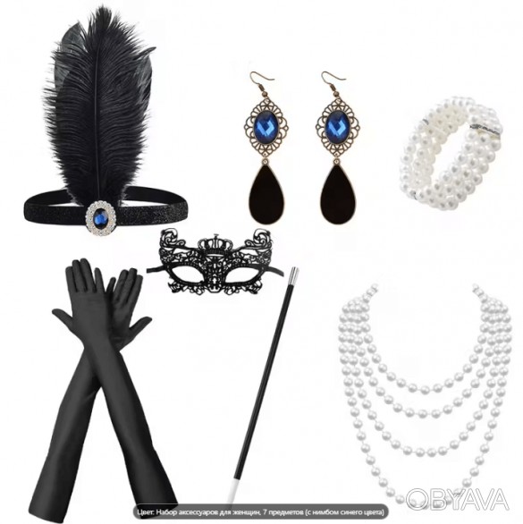 Карнавальный набор аксессуаров в гангстерском стиле — это продуманный до мелочей комплект, который мгновенно завершает образ и превращает вас в утончённую героиню ретро-эпохи. Всё, что нужно для создания безупречного лука, уже собрано в одном наборе. В комплект входят: Эффектный головной убор с пышными перьями и изысканной диадемой с камнем синего цвета в центре — придаёт образу нотку роскоши и театральности – 1 предмет Пара длинных чёрных перчаток, идеально подчёркивающих изящество рук – 2 предмета Ажурная маска кружевная, создающий ауру загадочности и женственности – 1 предмет Трёхрядный браслет из крупных жемчужин — символ классической элегантности – 1 предмет Четырёхрядное жемчужное ожерелье, добавляющее блеск и винтажное очарование – 1 предмет Мундштук длиной 32 см в стиле Голливуда 30-х годов — штрих, без которого не обходится ни один вечерний гламурный наряд – 1 предмет Серьги с камнями синего цвета из метала типа бронза с выразительным гангстерским дизайном, гармонично завершающие ансамбль – 2 предмета Итого 9 предметов (7 аксессуаров) На фото представлены все элементы набора с точными размерами. Такой комплект позволит без труда создать завершённый, уверенный и эффектный образ для костюмированной вечеринки, ретро-балла, новогоднего корпоратива или маскарада. Всё, что останется — выбрать подходящее платье, и вы готовы блистать в стиле настоящей леди из эпохи джаза и гангстерских легенд.
