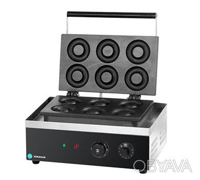 Аппарат для пончиков HURAKAN HKN-GES6D Количество пончиков - 6 шт. Материал корпуса: нержавеющая сталь. Материал жарочной поверхности: чугун с антипригарным покрытием. Габариты: 385x410x320 мм. Подключение: 1,5 кВт, 220В. Вес: 8кг