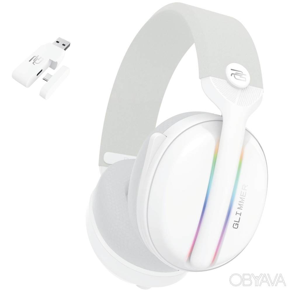 Бездротова ігрова гарнітура Proove Gaming Glimmer (APP) White — стиль і витривалість для перемог Proove Gaming Glimmer — універсальні геймерські навушники з двома бездротовими режимами (2.4 ГГц + Bluetooth 5.4), що поєднують насичений звук, стабільний зв’язок і наддовгу автономність. Білий колір White, м’які амбушури та ергономічна посадка створюють комфорт для тривалих сесій, стримів і спілкування в голосовому чаті. Кому підійде Геймерам, яким потрібна мінімальна затримка та надійний зв’язок у шутерах, MOBA та RPG. Стрімерам і тим, хто часто користується voice‑chat — чіткий голос і зручний мікрофон. Для навчання, дзвінків і мультимедіа — щоденне використання без зайвих дротів. Ключові переваги Два способи підключення: швидкий 2.4 ГГц для мінімальної затримки та Bluetooth 5.4 для універсальності. Потужне звучання з драйверами Ø40 мм і діапазоном 20 Гц – 20 кГц. Наддовга автономність: до ~82 год без підсвічування в Bluetooth‑режимі; до ~38 год у режимі 2.4 ГГц без підсвічування. Комфорт щодня: м’які амбушури, легка вага 226 г, зручне керування з навушників. Стильний вигляд: динамічний геймерський дизайн з RGB‑ефектами. Сумісність: ПК, консолі та смартфони; заряджання Type‑C. Дизайн та комфорт Міцний ABS‑корпус витримує щоденне використання, а ергономічна посадка мінімізує втому. RGB‑підсвічування підкреслює атмосферу гри та візуально доповнює ваш сетап. Якість звуку та голосу Драйвери Ø40 мм забезпечують насичений бас і чіткі верхи. Чутливий мікрофон (−38 ±3 дБ) знижує фонові шуми та чітко передає голос у командних іграх і дзвінках. Автономність і підключення Акумулятор 900 мА·год, заряджання ≈2 год через USB Type‑C. Час роботи (до 80% гучності): Bluetooth з підсвічуванням — ~14 год Bluetooth без підсвічування — ~82 год 2.4 ГГц з підсвічуванням — ~12 год 2.4 ГГц без підсвічування — ~38 год Стабільне з’єднання на відстані до 10 м. Технічні характеристики Параметр Значення Матеріал ABS Версія Bluetooth 5.4 Профілі A2DP, HFP, AVRCP, HSP Драйвери Ø40 мм Чутливість динаміка 114 ±3 дБ Чутливість мікрофона −38 ±3 дБ Діапазон частот 20 Гц – 20 кГц Режими роботи 2.4 ГГц + Bluetooth Відстань підключення до 10 м Акумулятор Літієвий, 900 мА·год Час заряджання ~2 години (Type‑C, Type-A) Робоча напруга 3.7 V Опір 2.2 kΩ Розмір продукту 189 × 180 × 83 мм Вага 226 г Колір White Порт USB Type‑C, USB Type-A Гарантія 12 місяців Порада: для максимальної автономності вимикайте RGB‑підсвічування та зменшуйте гучність у неігрових сценаріях. Proove Gaming Glimmer (APP) White — витривала, зручна та стильна гарнітура для геймерів, які цінують стабільність, якісний звук і свободу вибору підключення (2.4 ГГц + Bluetooth).