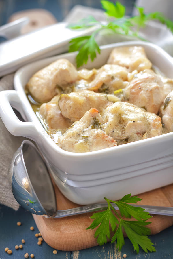 - Жареную курицу переложите в сковороду со сметанным соусом и хорошо перемешайте. Присыпьте блюдо сухим тимьяном, плотно накройте крышкой и тушите 20 минут.