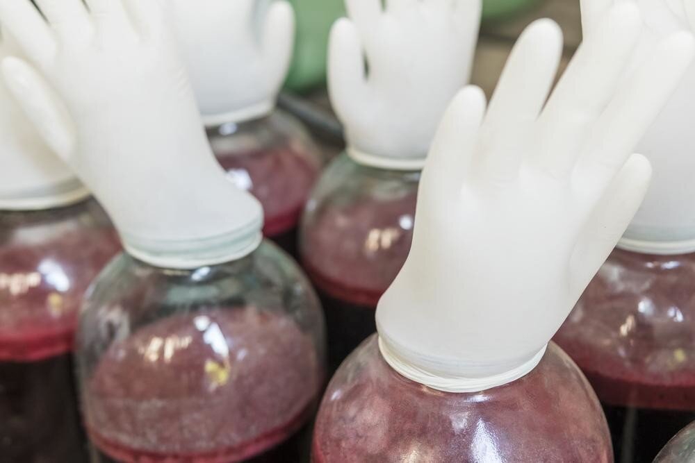 - После того как перчатка сдуется, а вино посветлеет его необходимо слить в чистую банку, отделив от осадка. Для этого неспеша переливайте чистую жидкость, оставляя немного вина с осадком на дне. Не жалейте.