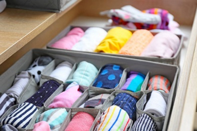 Еще носочки и колготки не займут много пространства, если их хранить скрученными в небольшой рулон. Носки разместите в отдельных сотах, которые можно обозначить цветом той вещи, которая в них хранится. Приклейте на ячейку яркую бумажку, где будет указана нужная пара носочков, а если вы любительница нестандартных и прикольных решений, то постарайтесь сделать забавную фотографию в данной паре носков и наклейте ее на отсек.