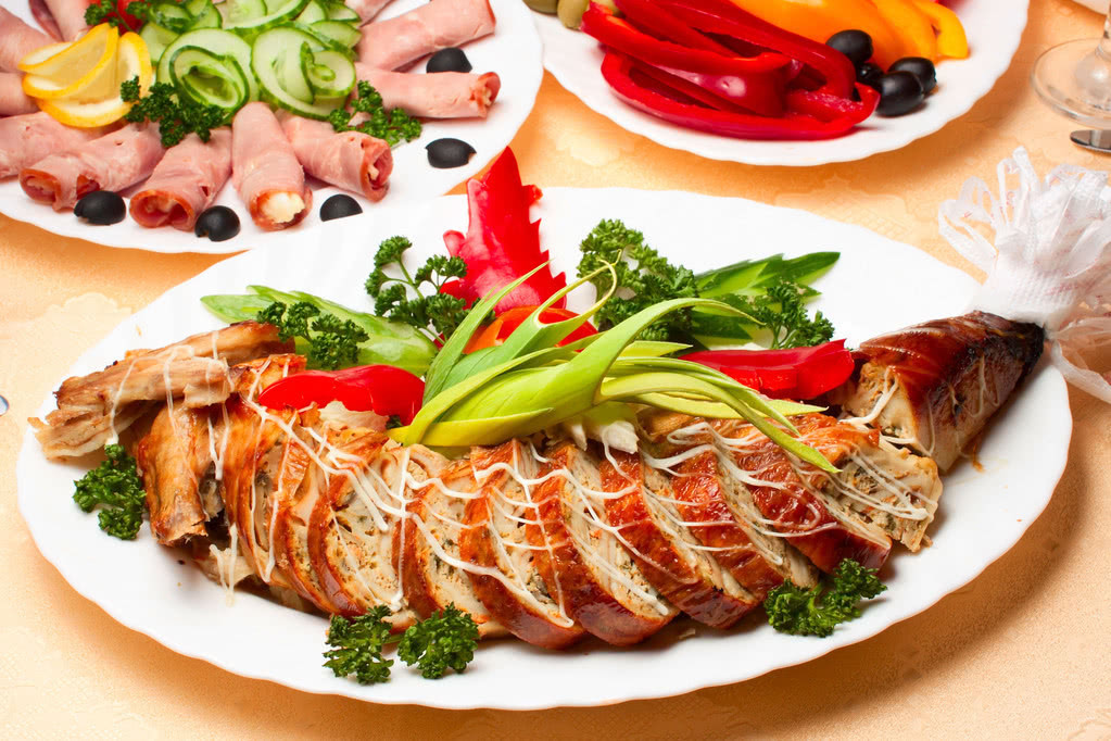 Подают фаршированную щуку к столу в холодном виде. Для украшения можно выполнить из майонеза ажурную сеточку, а затем выложить яркие ягоды клюквы. Из сочного лепестка луковицы с вырезанным зубчатым краем делают корону, которую прикрепляют к голове. Царское рыбное блюдо готово.