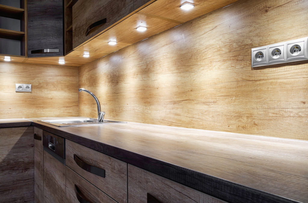 - Установка осуществляется после расстановки мебели, что позволяет упростить расчеты размеров фартука.