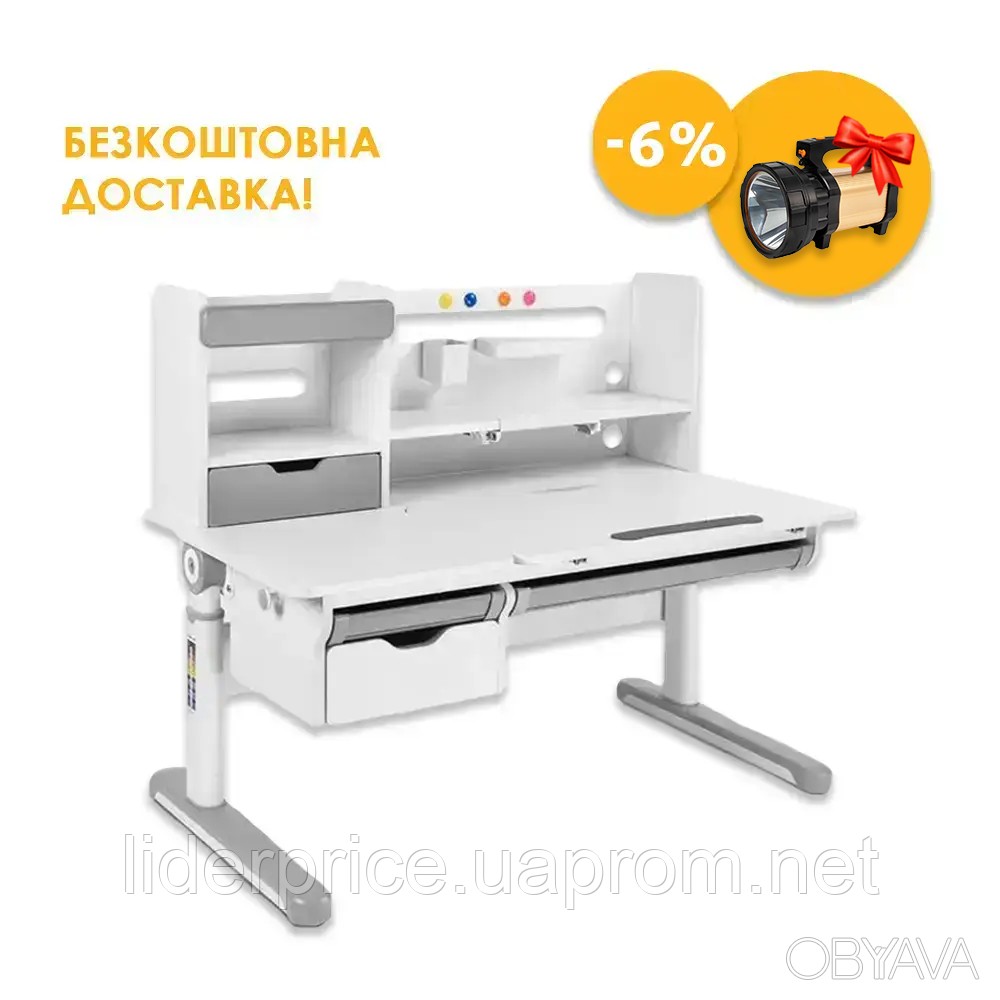 Ергономічна парта, що росте, з місткою надбудовою. Надбудова містить одну шухляду, три полиці, висувну підставку для книг і спеціальні отвори для кріплення аксесуарів.