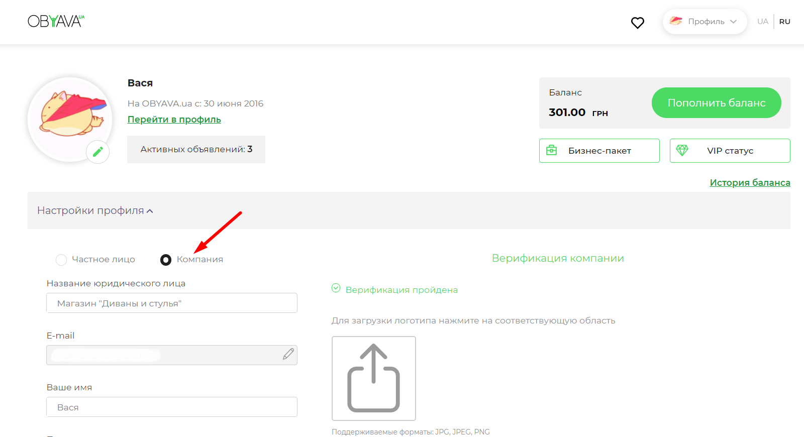 Для доступности импорта, ваш профиль должен быть переведен в статус «Компания». Пройдите в настройки своего профиля и установите выбор «Частное лицо / Компания» в состояние «Компания». Введите название компании.