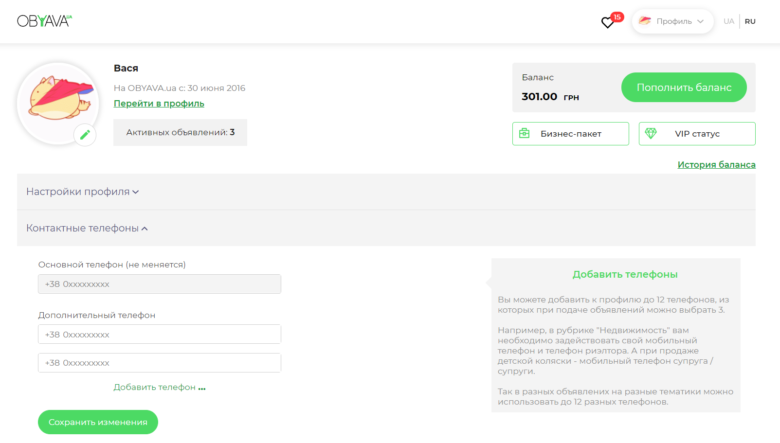 Для дополнительной контактной информации вы имеете возможность внести еще до восьми телефонов. Для этого в "Профиле" зайдите в раздел "Настройки", найдите под основным телефоном строку "Добавить телефон..." и нажмите на нее. В появившееся окно внесите дополнительный номер телефона. Чтобы сохранить внесенную информацию, нажмите на кнопку "Сохранить изменения".