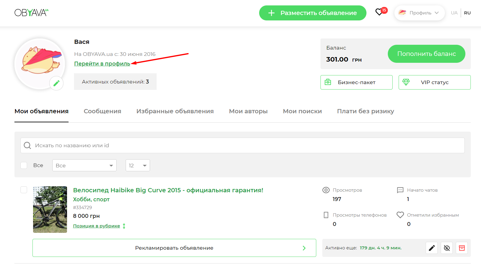 Каждый пользователь OBYAVA.ua в своём профиле имеет отдельную страницу с активными товарами и услугами "Объявления профиля". На этой странице вы можете просмотреть свой профиль так, как его видят ваши покупатели и поделиться ссылкой на него в соцсетях.
