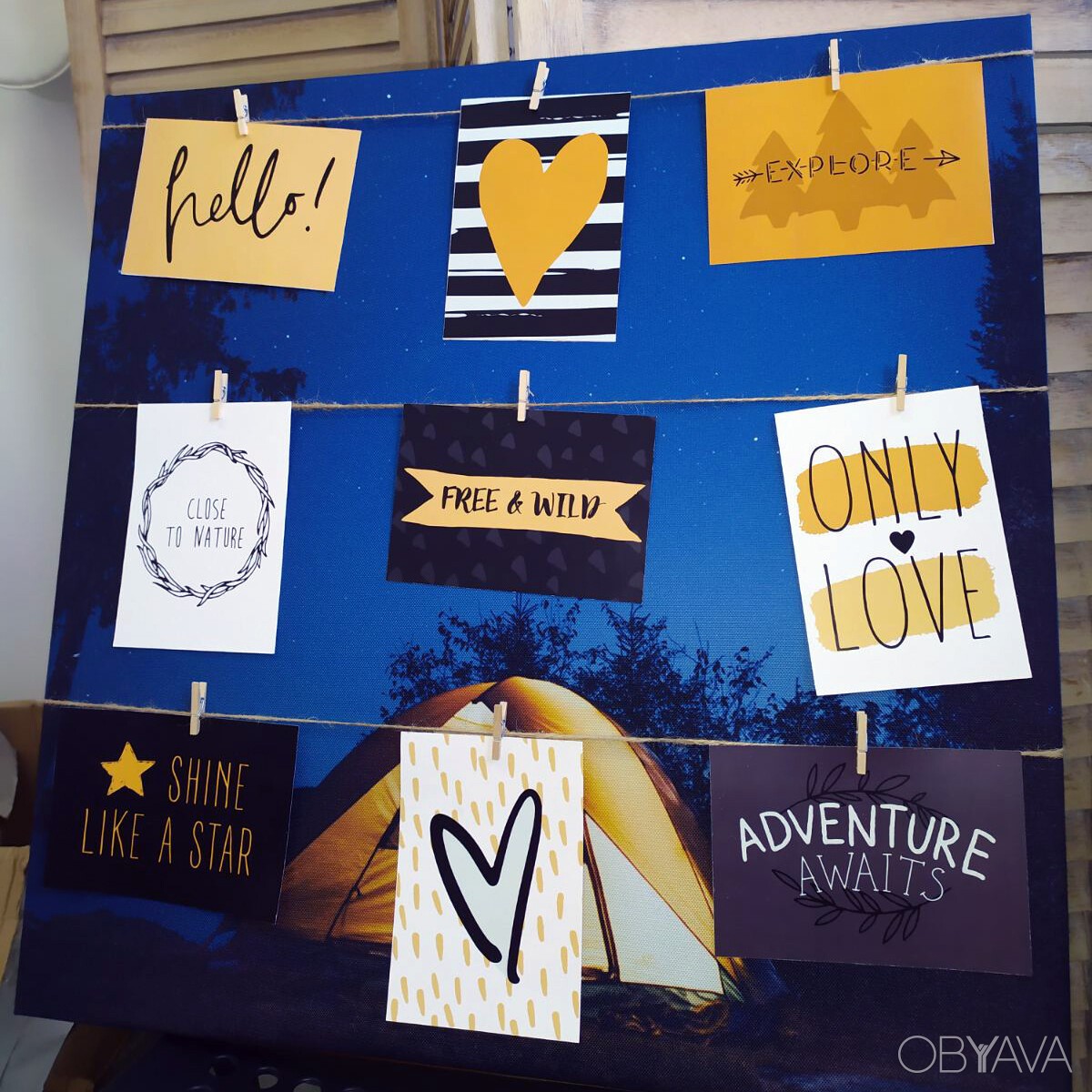У комплекті: панно, декоративний шнур, прищіпки, листівки.
