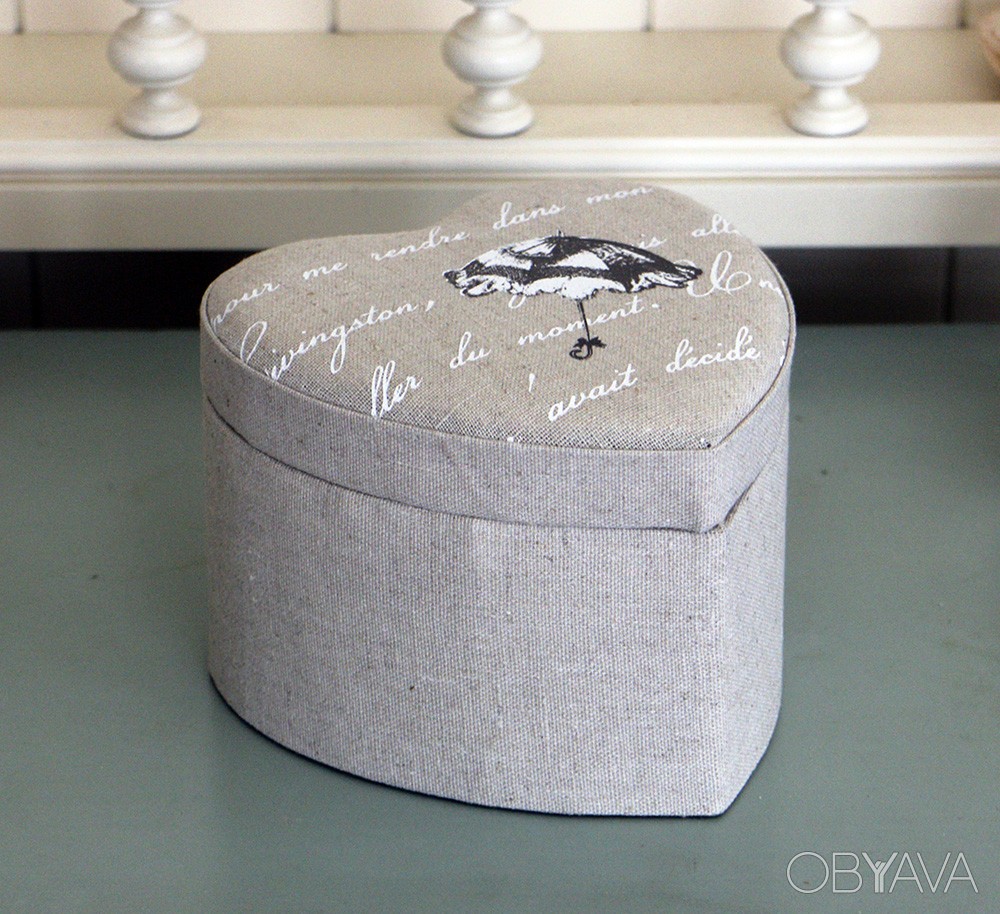 Оригинальная шкатулка в форме сердца, изготовлена из МДФ и обшита льном с изображением зонта.