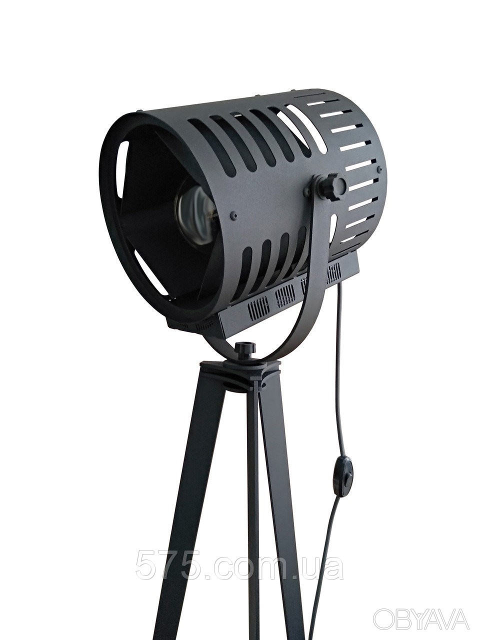 Напольный торшер в стиле Лофт. В изготовлении прожектора использован металл. Корпус прожектора покрыт качественной порошковой краской в цвете черный матовый муар с незначительным блеском. Основание торшера выполнено в виде стойки с тремя упорными ножками.