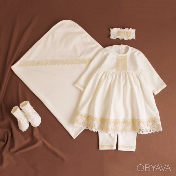 У комплекті плаття, штани-лосіни, пов'язка, пінетки та бавовняна крижма для хрещення.