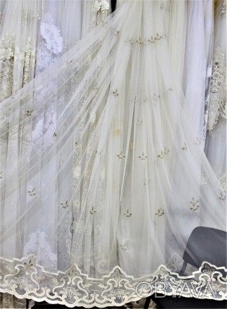 Тюль с золотой бархатной вышивкой по низу и камнями. По всему тюлю к самому верху идут маленькие коронки с камнями. Цвет -