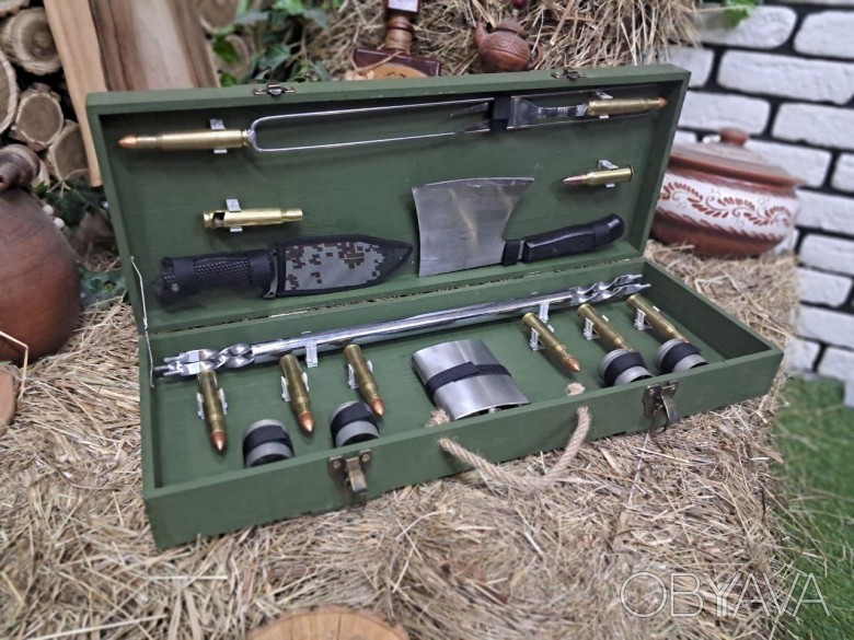 Цей набір шампурів зроблено колишніми військовослужбовцями з відстріляних гільз 12.7 мм (з імітацією кулі на кінці), справжні кулі з яких точно били ворога на Куп'янському напрямку. Для зручності обслуговування ручки всіх шампурів відгвинчуються. Всі аксесуари підібрані за стилем і довго служитимуть своєму власнику.