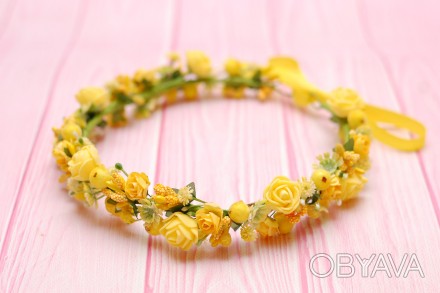 Об'ємний віночок з квітами виконаний у жовто-блакитному кольорі.Квіти тканеві. Віночок чудово доповнить Ваш образ. Ідеал -