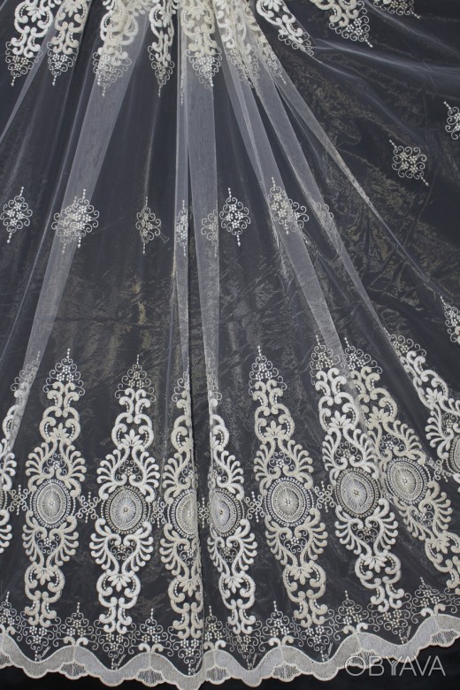 Тюль с объемной вышивкой по всей тюли. По низу и середине густая классическая вышивка шениловой ниткой. Между ними полоска с мелких классических коронок. Узор вышит белой и золотой ниткой. Цвет основы европейский белый.