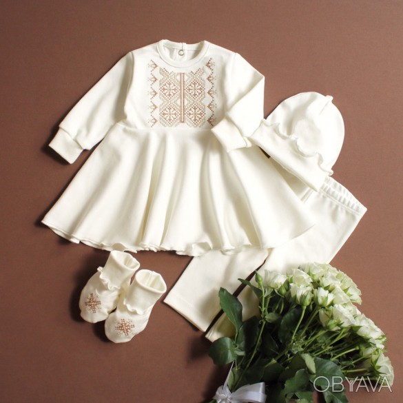 Комплект дитячого одягу для хрещення дівчинки складається із 4 предметів: сукня, штани, шапочка, пінетки.