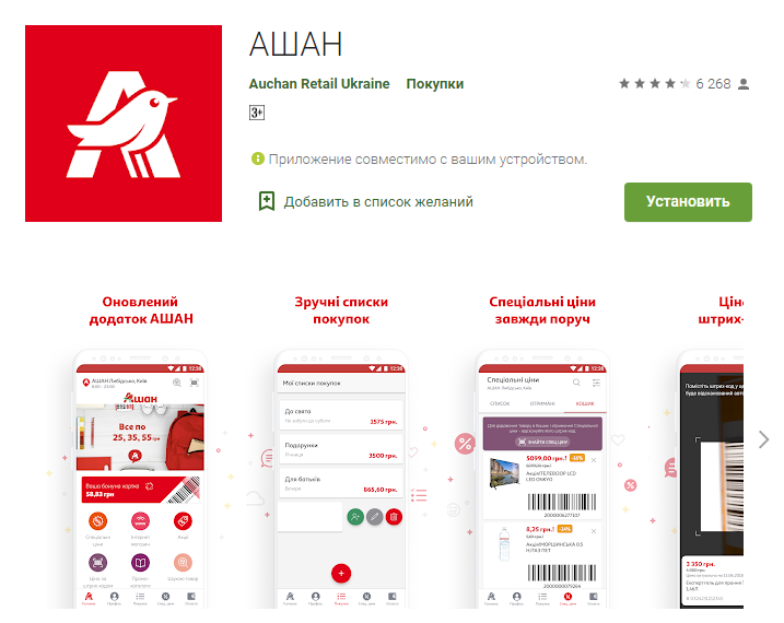 Гіпермаркет використовує мобільну версію сайта. Але мобільний застосунок пропонує користувачам додаткові корисні функції, порівняно з версією Auchan онлайн.