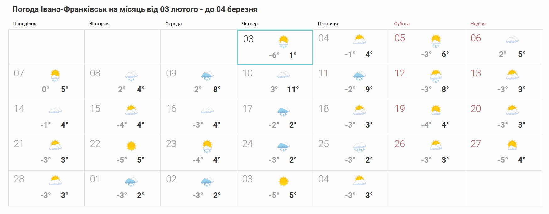 Причому різниця між нічною і денною температурою буде сильною. Наприклад, 27 лютого вдень буде 4°C тепла, а вночі — -5°C морозу. Такі різкі перепади можуть негативно позначитися на самопочутті.