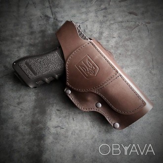 Кобура выполнена из плотной натуральной кожи, что обеспечивает долговечность и надежность. Тиснение с изображением Тризуба Украины подчеркивает уникальность и патриотичный стиль изделия. Крепление рассчитано на ремень шириной до 5 см, что делает ношение комфортным и обеспечивает надежную фиксацию.