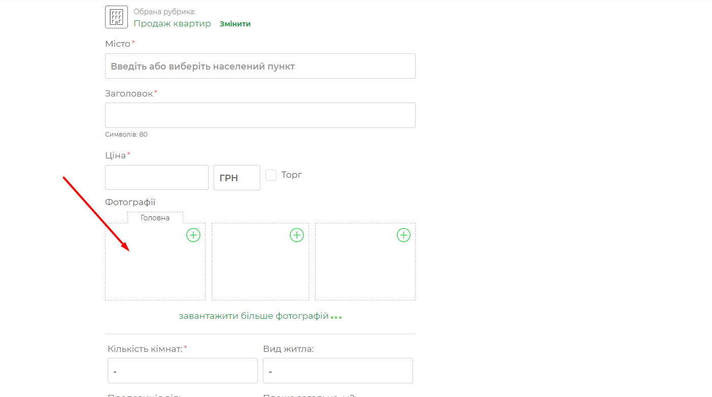 Для того щоб додати фотографії, в режимі подачі, редагування або оновлення натисніть на плюсик під словом «Фотографії», після цього завантажте фото. Допустимий розмір фотографій не більше 5 Мb. Завантажуйте фотографії у форматі .jpg, .jpeg, .png або .gif. Максимальна кількість фотографій 12, для Бізнес-пакету - 50.