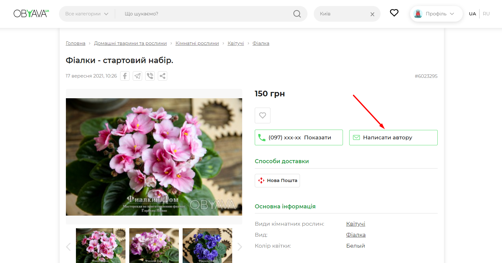 Щоб почати розмову з продавцем, необхідно перейти на сторінку товару, який вас цікаваить, і під блоком фотографій натиснути на посилання «Особисте повідомлення».