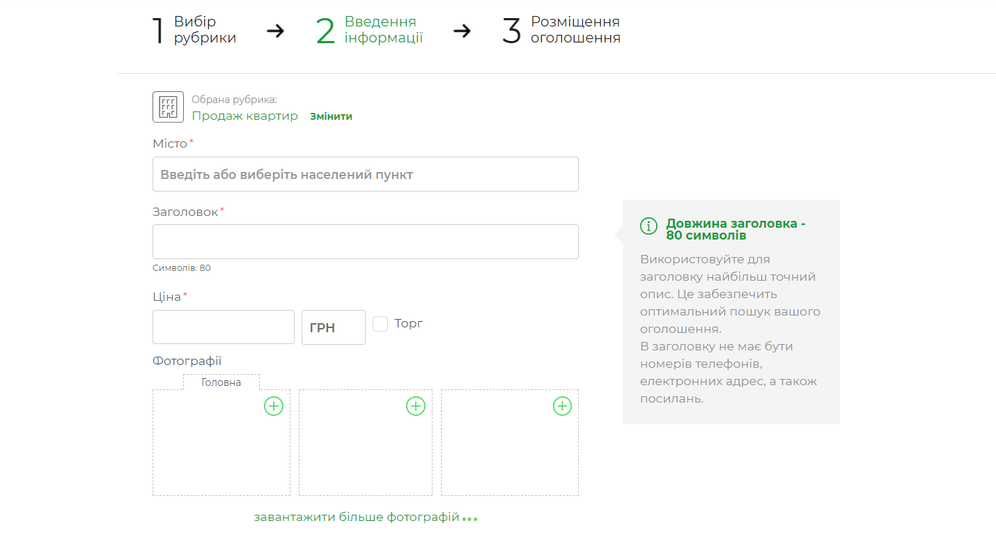 На головній сторінці сайту натисніть кнопку «Розмістити оголошення». Виберіть найбільш підходящу рубрику, а потім підрубрику для вашого оголошення. Заповніть всю необхідну інформацію у відповідних полях.