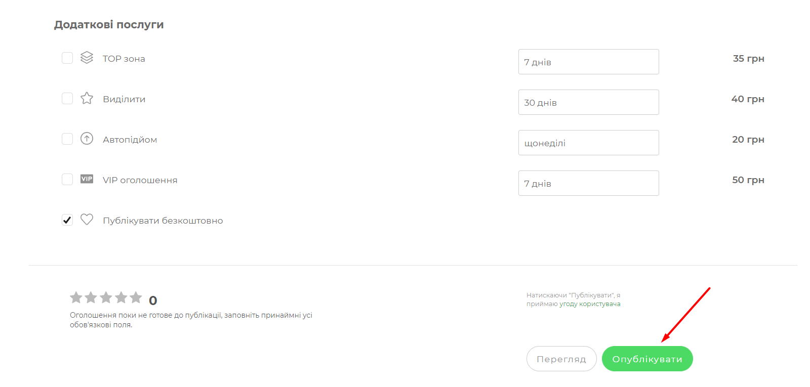 Щоб зробити цей процес максимально простим, звертайтеся до підказок. Якщо полів недостатньо для повноцінного опису товару або вони не відповідають жодному з його параметрів, тоді давайте максимально детальний опис та фотографії. Після заповнення всіх полів натисніть кнопку «Опублікувати» в нижньому правому куті екрану. Перед відправленям оголошення на модерацію, вам пропонується скористатися платними послугами для його просування.