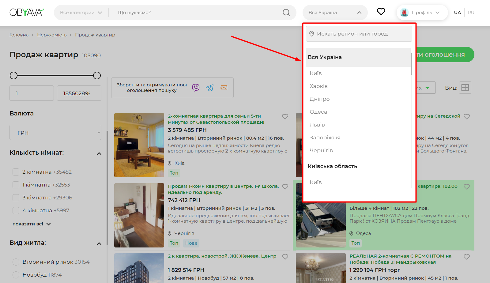 Перед початком пошуку оголошень необхідно вибрати регіон, який вас цікавить, місто або районний центр. Для більш точного пошуку місцезнаходження товару або послуги ви можете додатково вибрати район міста, передмістя або село. Для цього вам необхідно зайти в необхідну рубрику і підрубрику та у рядку пошуку вибрати необхідний регіон.