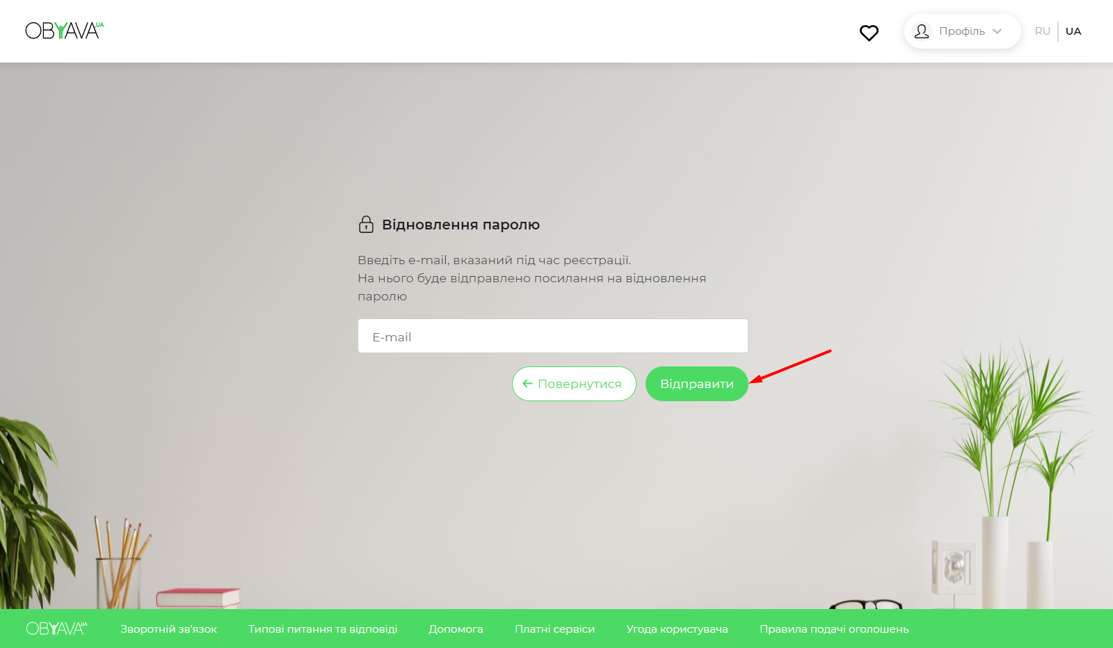 У вікні, що ви бачите, введіть адресу електронної пошти, вказану при реєстрації, і натисніть «Відправити».