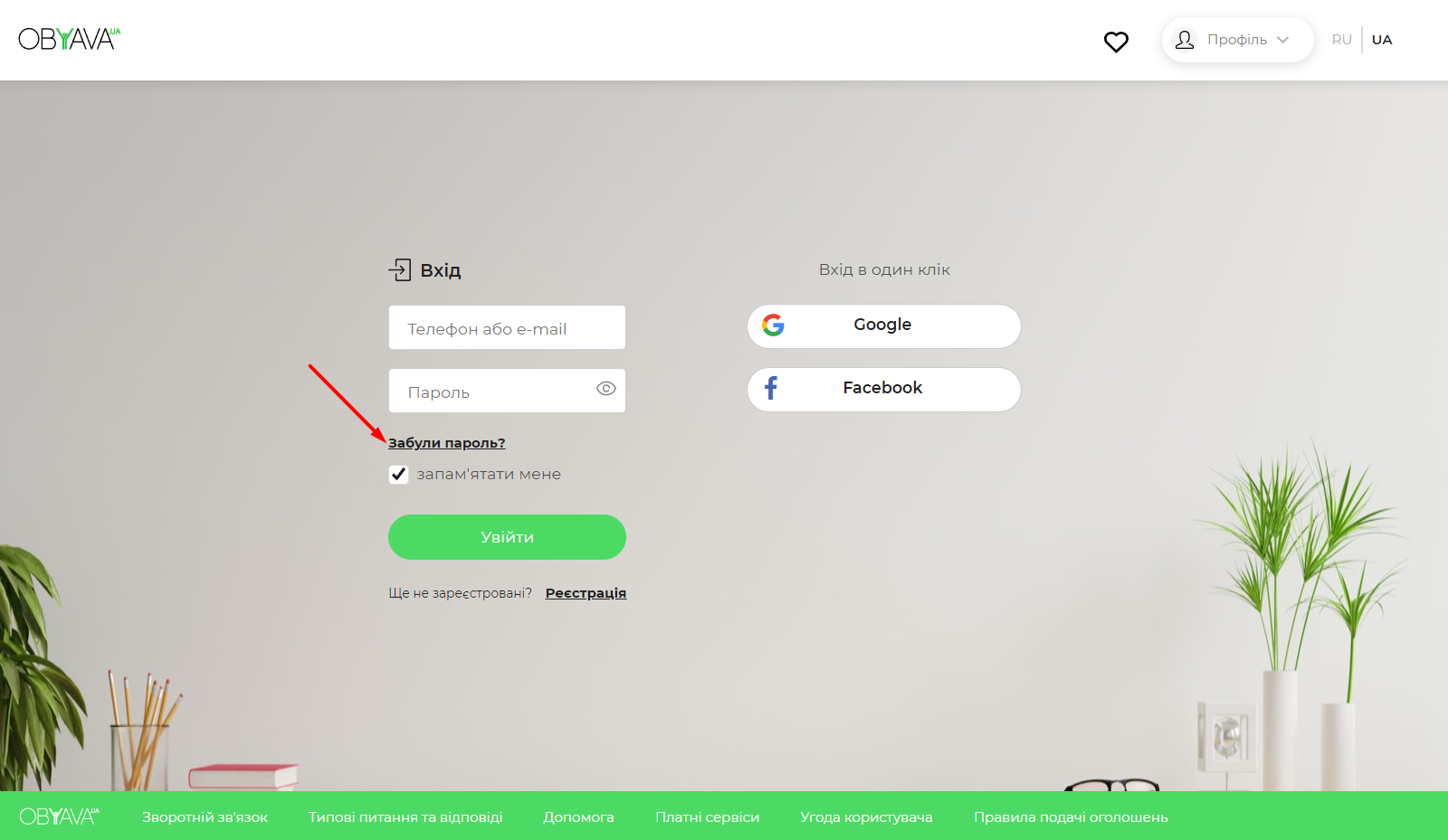 Для відновлення паролю на сайті перейдіть за посиланням «Забули пароль?» на сторінцівходу в «Профіль».