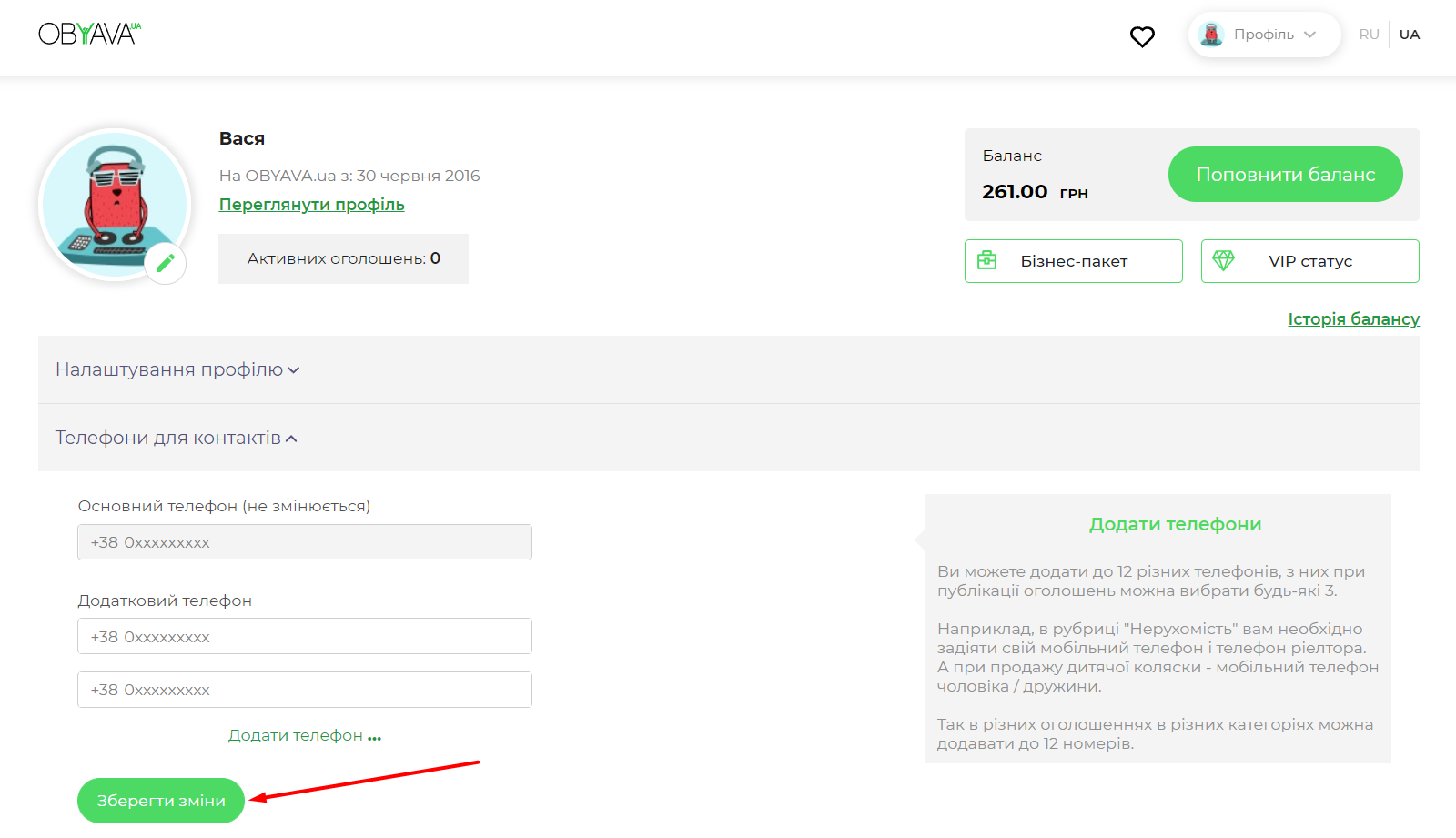 Для додаткової контактної інформації ви маєте можливість внести ще до восьми номерів телефонів. Для цього в «Профілі» зайдіть в розділ «Налаштування», знайдіть під основним телефоном рядок «Додати телефон ...» і натисніть на неї. У вікні, щоз'явилося, внесіть додатковий номер телефону. Щоб зберегти внесену інформацію,натисніть на кнопку «Зберегти зміни».