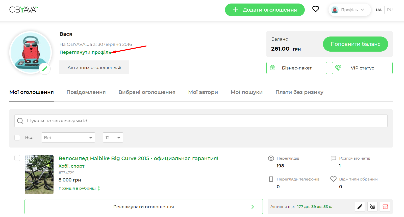 Посилання на "Оголошення профілю" в розділі "Мої оголошення"