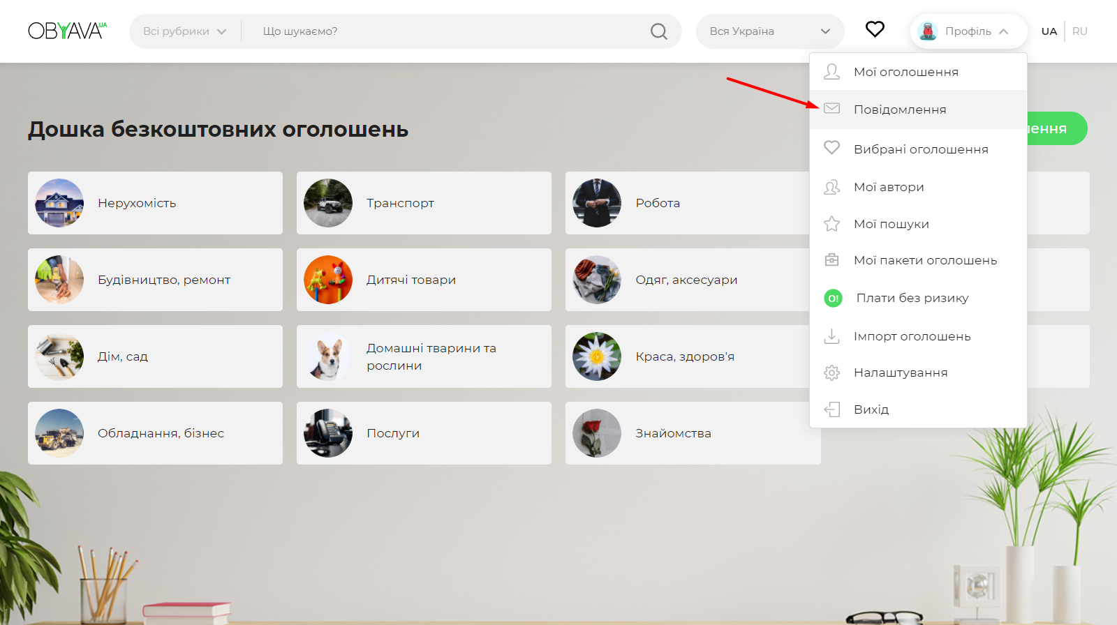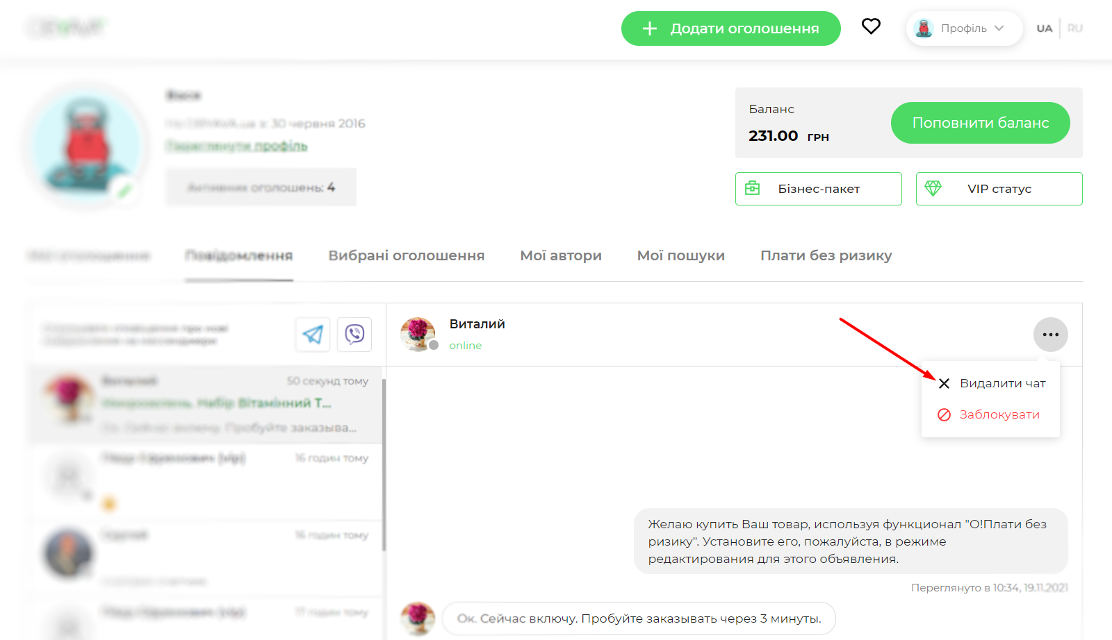 Всі ваші повідомлення зберігаються в розділі «Повідомлення». Для того щоб потрапити в цей розділ, наведіть курсор мишки на меню «Профіль» вгорі сайту і з випадаючого списку оберіть пункт «Повідомлення». Тут відображається вся історія ваших повідомлень.