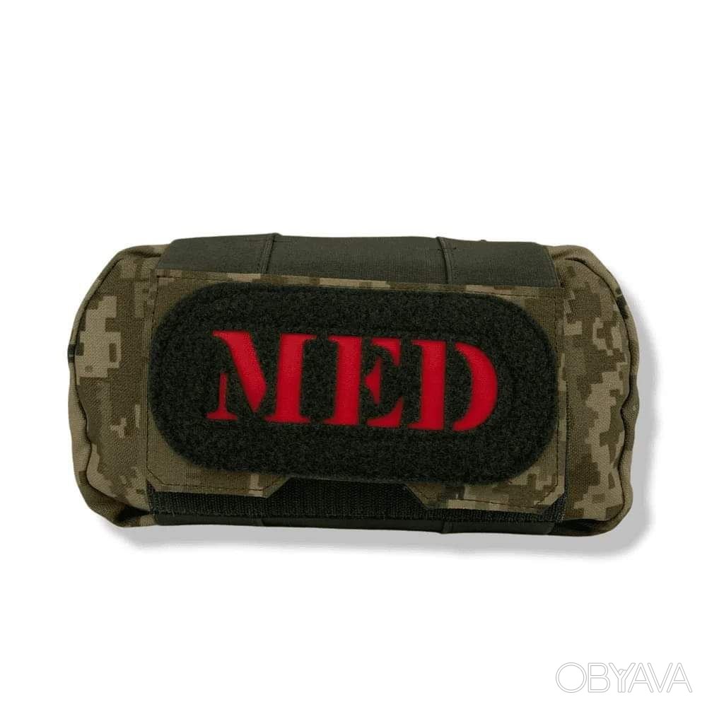 Складається з двох частин: сумки з внутрішнім органайзером під (індивідуальну аптечку першої допомоги) та бази, яка кріпиться на спорядження, і в яку вкладається сама сумка.
