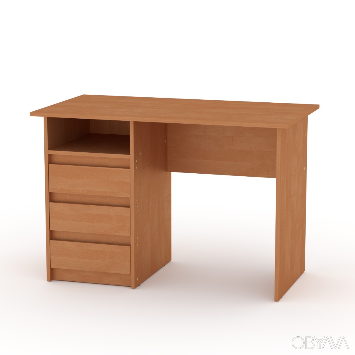 Письменный стол Декан изготовлен из ламинированного ДСП, толщиной 16 мм, кромка ПВХ 0,5 мм. Стол содержит просторную столешницу, тумбу с тремя выдвижными ящиками и одной открытой нишей, которые разместят книги, бумаги, канцелярские и письменные принадлежности. Такая модель позволит максимально эффективно использовать пространство комнаты и создаст идеальное место для работы и учебы.